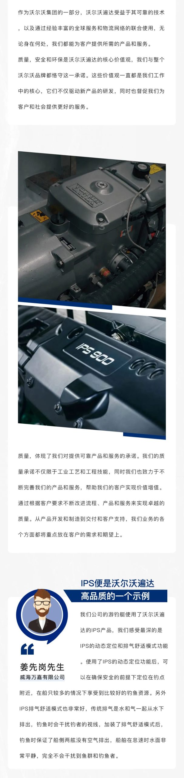 我國(guó)是海洋、航海大國(guó),與航海相關(guān)的事業(yè)群,如航運(yùn)、港口、漁業(yè)、造船、海洋石油開(kāi)發(fā)等產(chǎn)業(yè)在我國(guó)國(guó)民經(jīng)濟(jì)和社會(huì)發(fā)展中占據(jù)十分重要的地位。沃爾沃遍達(dá)作為海洋動(dòng)力解決方案的提供方,始終以?xún)?yōu)質(zhì)的發(fā)動(dòng)機(jī)產(chǎn)品及配套系統(tǒng)和不斷革新的技術(shù),助力航海相關(guān)行業(yè)的發(fā)展,保護(hù)海洋的原始生態(tài)環(huán)境。
